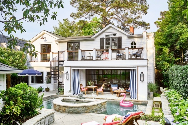 The vinyl paneling that protects against the outdoors is a nice touch to keep summertime inconveniences like pests at bay. The steel beams that support the upper deck and allow for unobstructed views of the gorgeous pool and the elegant backyard alongside the spiral staircase leading to the upper deck add class and character to the space.
