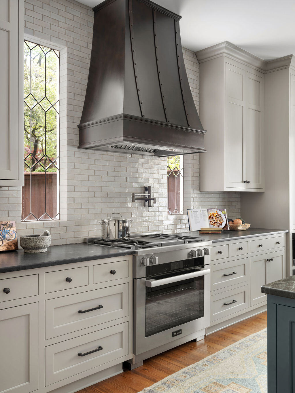 The kitchen underwent a transformative renovation to become a modern, functional space while retaining its Craftsman charm. A custom range hood with a dark, industrial-style finish serves as the kitchen's centerpiece, flanked by stained glass windows that tie this home to its roots. White shaker cabinets provide a timeless look, offering significant storage space, and are complemented by a glossy subway tile backsplash that adds texture and a clean aesthetic.